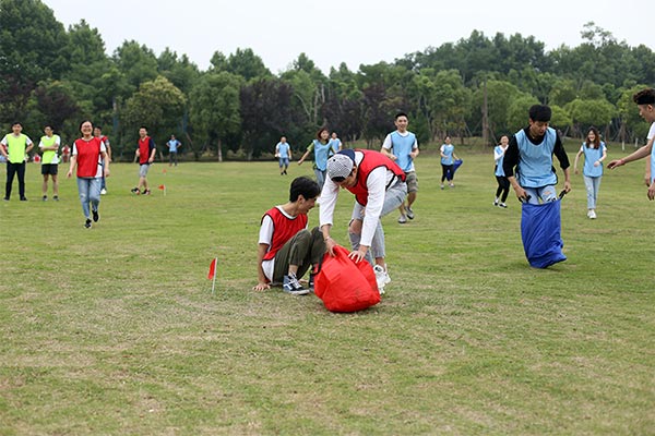 第二個(gè)比賽是四人五足,顧名思義就是每組派出4名隊(duì)員參加,用游戲道具將4個(gè)人的腿兩兩綁在一起,四人并行,先到終點(diǎn)的隊(duì)伍獲勝,這個(gè)游戲考驗(yàn)的就是每組隊(duì)員配合的默契性,不是一個(gè)人跑的快就可以,一定要和大家步調(diào)一致才行。一二一二、一二一二紅隊(duì)的四個(gè)隊(duì)員邁著整齊的步伐,喊著響亮的口后,雖然一開(kāi)始他們并不是最快的,但是他們一直跟隨著自己的口號(hào)節(jié)奏,逐步趕上前面的隊(duì)伍,有的隊(duì)伍一開(kāi)始很快,但是缺乏口令,走著走著步調(diào)就不一致,有的隊(duì)伍中的隊(duì)員自己很著急,步子邁的很大,沒(méi)有顧及到其他隊(duì)員,導(dǎo)致摔倒或道具掉落,按照游戲規(guī)則要調(diào)整好了才能繼續(xù)比賽。最終紅隊(duì)獲勝。這個(gè)游戲就是告訴我們?cè)诠ぷ髦行枰嗷ヅ浜希拍芡瓿扇蝿?wù),很多事情不是你一個(gè)人就可以,個(gè)人英雄在企業(yè)里是不存在。